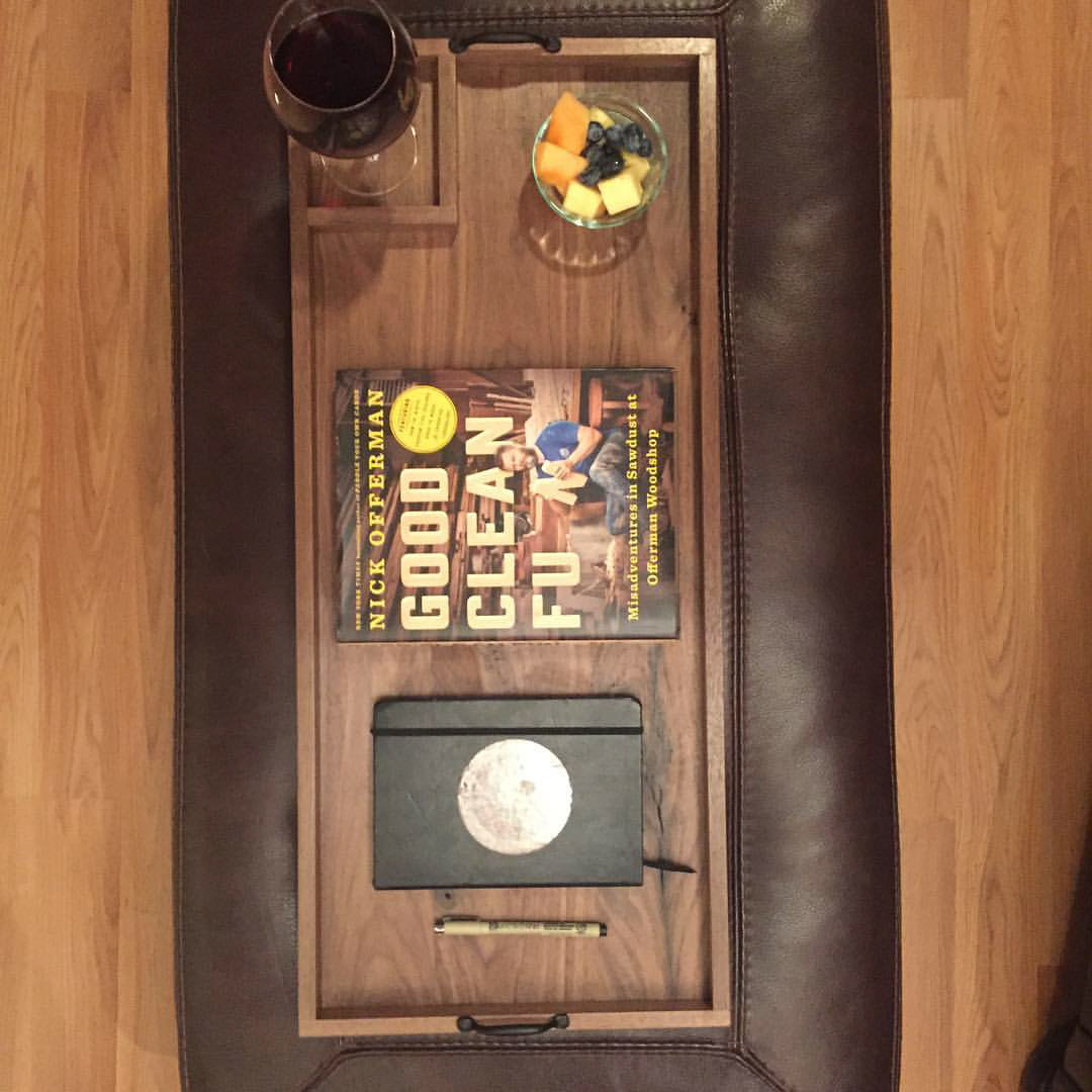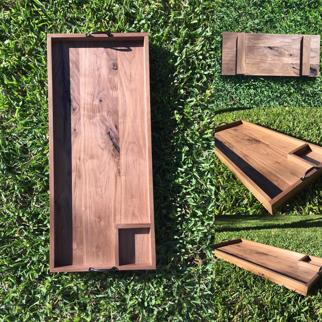 Customized bath caddy and/or serving tray made from all walnut hardwood. Cast iron handles were applied to the ends as well.
